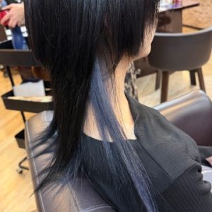 2026年3月8日ブラック×シアーパール×ウルフカット🖤🦋こんにちは、キャラ池袋本店の大村 です! 表面は地毛のまま残してカラーせず、黒髪のままにしています! インナー部分をブリーチして、SHISEIDOのアルティストカラーでくすみブルーのシアーパールをお入れしました! 普通の…続きを見る→ -