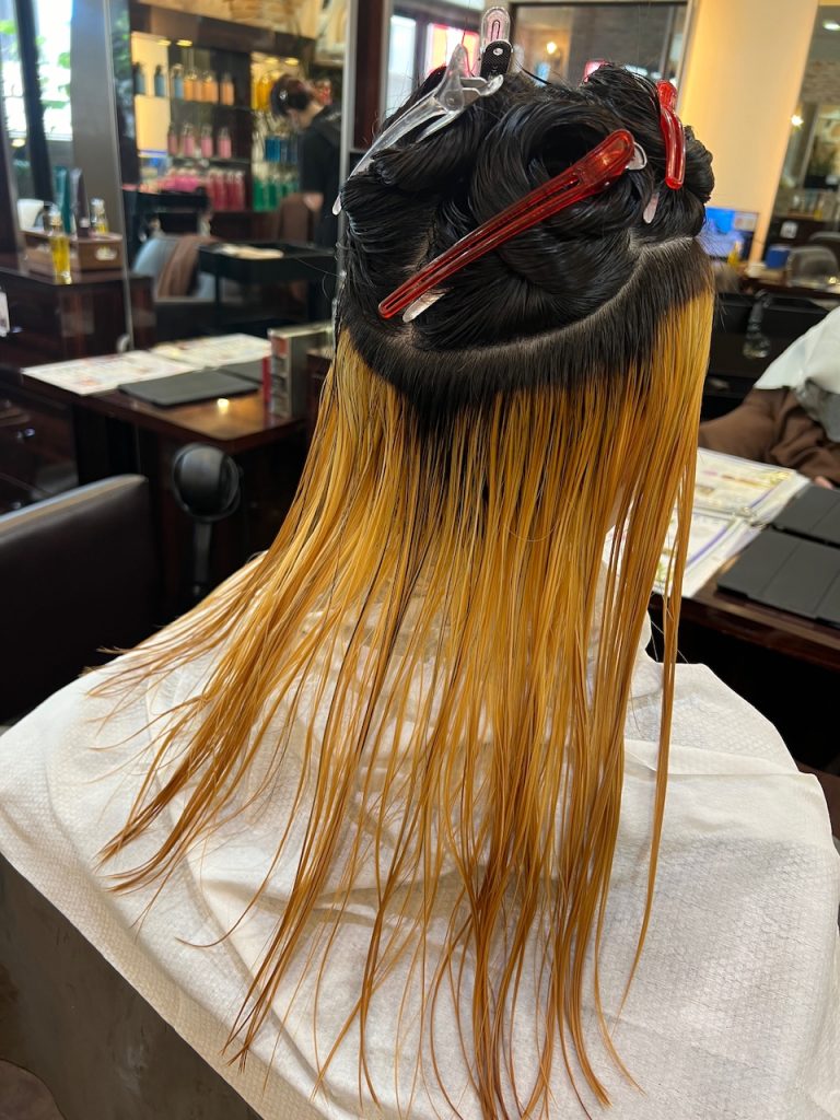 ・今までの髪の毛の履歴&ダメージ状態に合わせてケアブリーチの調整、ブリーチベースを均一にします。