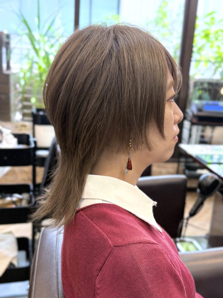 えり足長めのウルフカットですが、特に上の方にレイヤー(段差)を入れて動きや軽さを出すスタイルです!