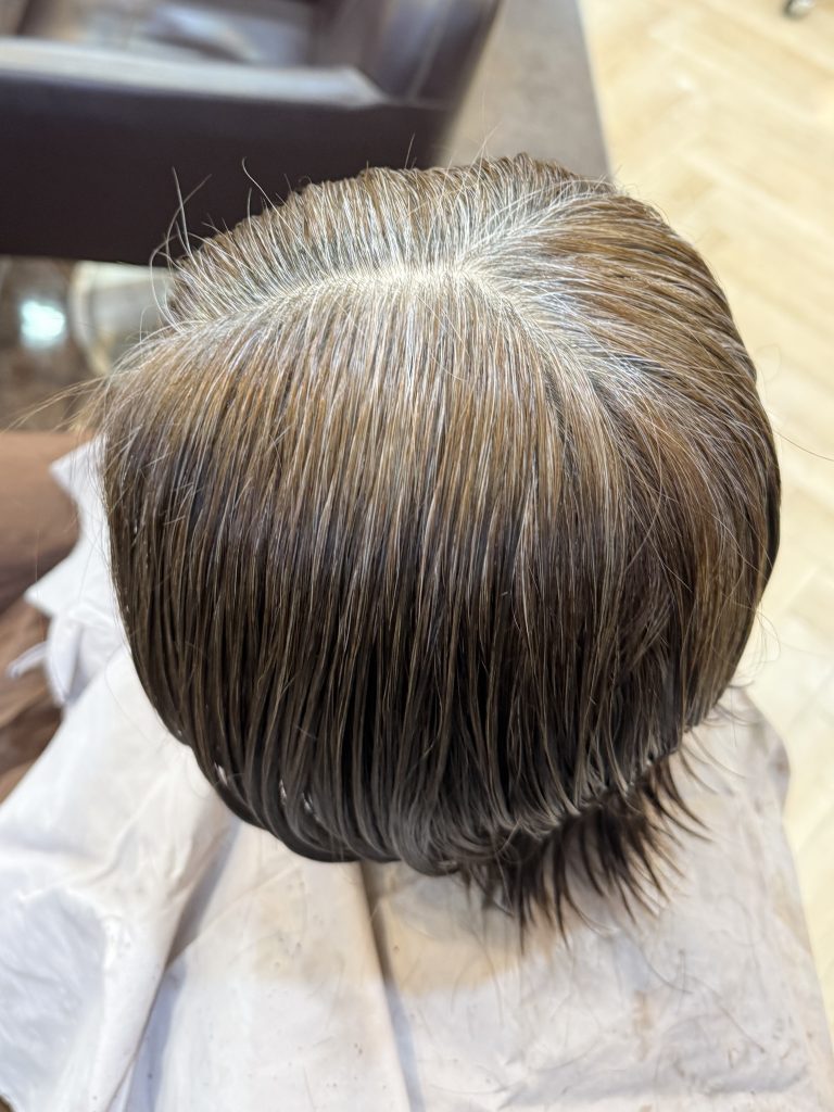 2ヶ月前にAVEDAカラーの白髪染め(7~8トーンの明るさ)をしていて、根本の白髪が伸びて目立ちやすくなっている状態
